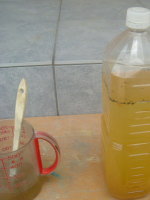 コレも施主様の希望でした。 実際に、サンプルを取ってみてどうなるの?と試してみることにしました。 まず、粉末を水に溶かしてみると、少し黄色になった水みたいな感じです。 そうして、ハケで工場にある桧や杉に塗ってみました。 乾くと「少し古い?」という感じのいい色になります。 素材によって、色の違いはあるようです。 外壁用木材防護保持材「ウッドロングエコ」を使ってみて 水に溶かすと、右のような感じになります。この施工(塗装)は、全部施主様にお願いしました。 工場に来ていただいて、一つ一つ丁寧に塗装していただいて、とっても助かりました。 自分の家づくりに参加していただけることは、 大工としても嬉しいことです。 I様は防腐剤などを使いたくない、とういことでこの外壁用木材防護保持材「ウッドロングエコ」を選ばれましたが、調べてみると多くの施設などにも使われているようです。 施工性もよくて色もいいし、なによりお値打ち! これはおすすめです! まだ、年月が過ぎてみないと、断言はできませんが、性能もいいみたいですね。